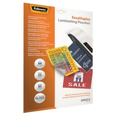 KezdőlapTechnológiaIrodatechnikaLaminálásMeleglamináló fólia, 80 mikron, A4, fényes, öntapadó, 25 db, FELLOWES "Admire Easy Display"